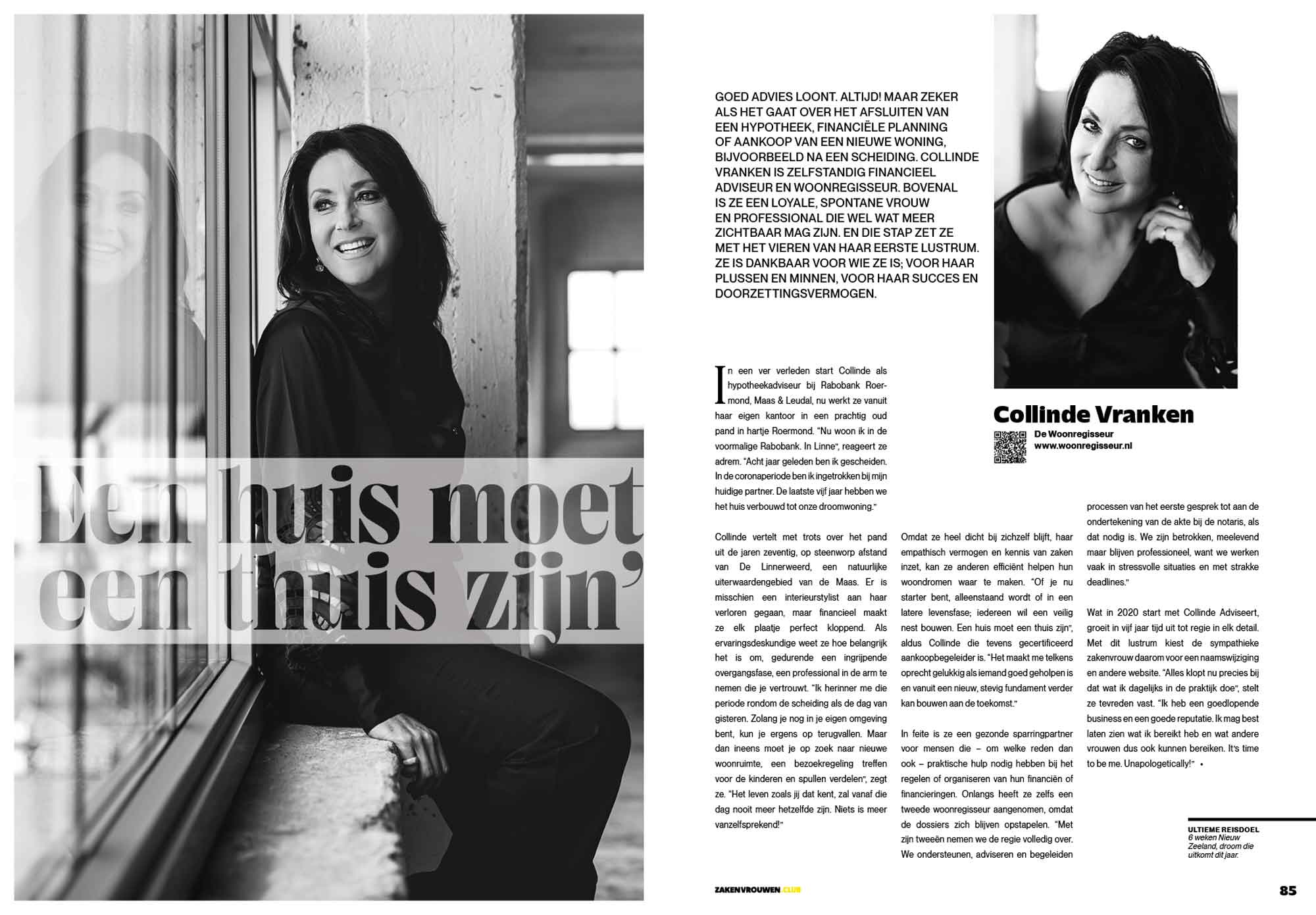 Collinde Vranken is opgenomen in de nieuwste editie van de glossy van de Zakenvrouwenclub. Deze club zet zich in voor het versterken van de positie van vrouwelijke ondernemers en leiders in het bedrijfsleven. Met hun magazine bieden ze een krachtig podium aan vrouwen die met lef, visie en doorzettingsvermogen hun eigen pad bewandelen.